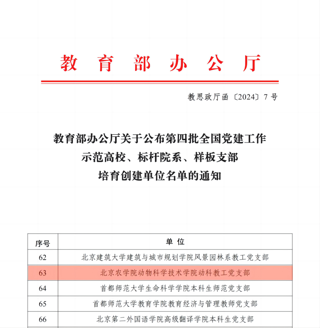 近日,教育部办公厅正式印发《关于公布第四批全国党建工作示范高校、标杆院系、样板支部培育创建单位名单的通知》(教思政厅函〔2024〕7号),世俱杯动物科学技术学院动物科学教工党支部获批“全国党建工作样板支部”培育创建单位。这是学校基层党建工作取得的又一项重要成绩,本次入选支部由校级党建“双创”项目培育产生。