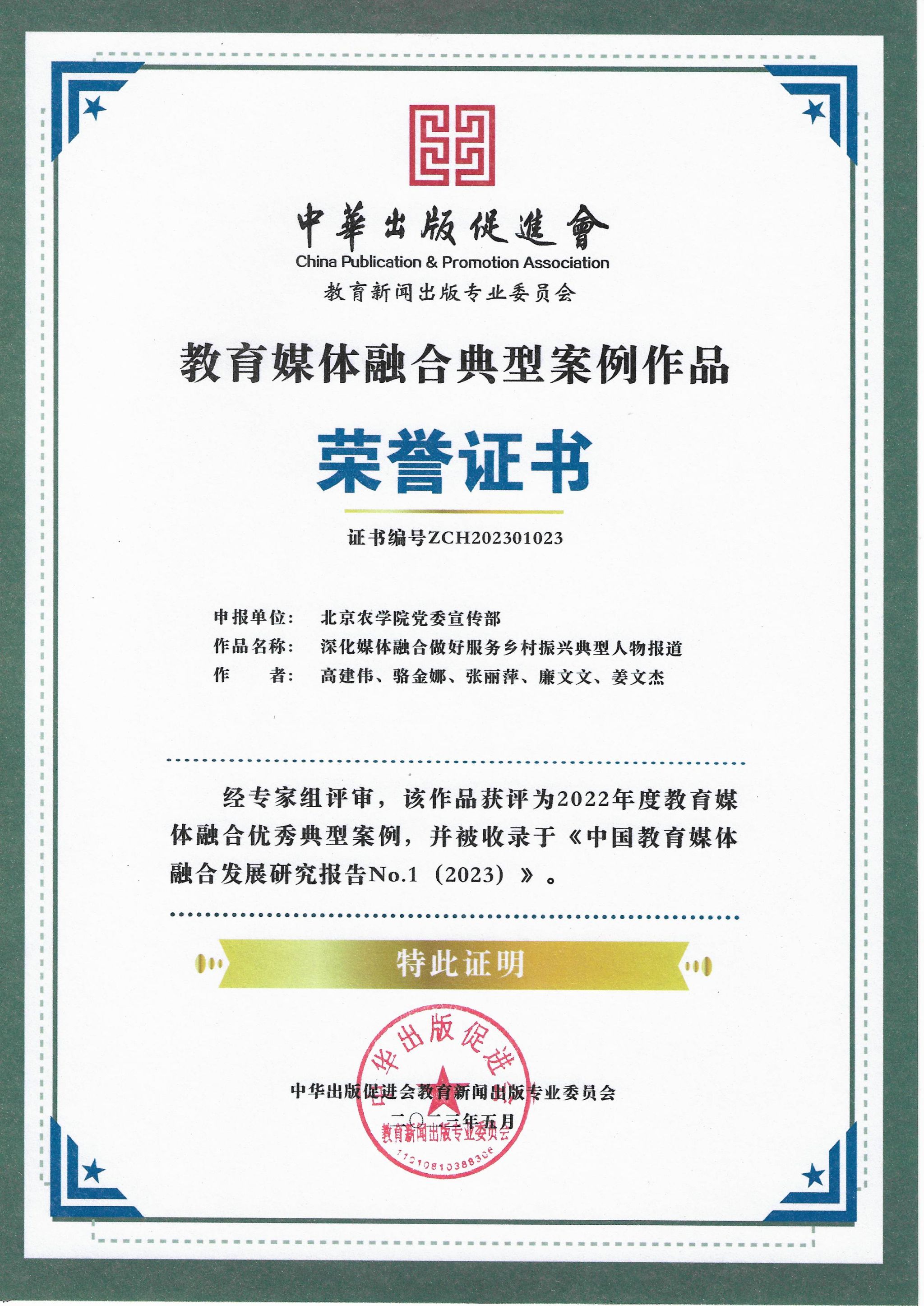 近日,由中华出版促进会教育新闻出版专业委员会主办的2023全国高校媒体融合发展高峰论坛暨媒体融合优秀案例发布会在京举行。来自全国近百所高校宣传部门负责人及获奖代表参会。会上对在高校教育媒体融合典型案例作品、案例项目、技术创新与应用场景征集活动中获奖的单位给予表彰并颁发荣誉证书。世俱杯党委宣传部申报的《深化媒体融合做好服务乡村振兴典型人物报道》案例作品,从全国高校126件申报作品中脱颖而出,被评为2022年度教育媒体融合优秀典型案例,并被收录于《中国教育媒体融合发展研究报告NO.1(2023)》。