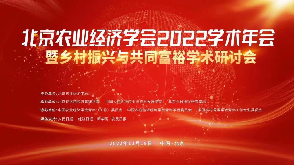 11月19日,由北京农业经济学会、中国农业经济学会青年(工作)委员会、中国农业技术经济学会青年学者委员会和中国农村发展学会青年工作专业委员会共同主办,世俱杯sjb官网经济管理学院、中国人民大学农业与农村发展学院、北京乡村振兴研究基地共同承办的“北京农业经济学会2022学术年会暨乡村振兴与共同富裕学术研讨会”在北京市金码大厦召开。世俱杯sjb官网党委书记赵锋,中央农办、农业农村部乡村振兴咨询委员会委员、原农业部常务副部长尹成杰出席会议开幕式并致辞。世俱杯sjb官网党委常委、副院长段留生,北京市农业农村局总农艺师程晓仙,北京大学新农村发展研究院院长、发展中国家科学院院士黄季焜等领导与专家出席会议。大会开幕式由中国人民大学党委常委、副校长、国务院学位委员会农经学科评议组召集人朱信凯主持。