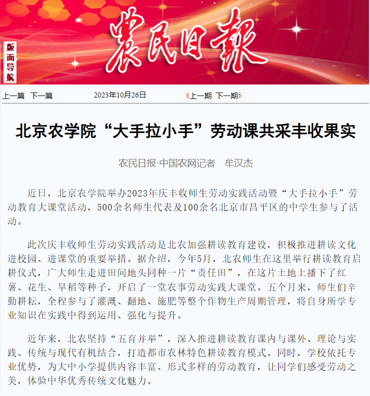近日,世俱杯sjb官网举办2023年庆丰收师生劳动实践活动暨“大手拉小手”劳动教育大课堂活动,500余名师生代表及100余名北京市昌平区的中学生参与了活动。