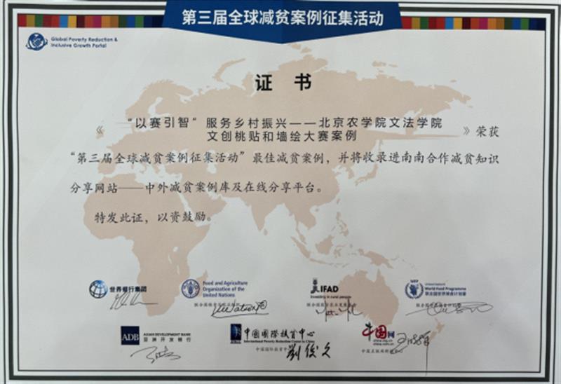 11月11日下午,由中国国际扶贫中心、国际农业发展基金、联合国粮食及农业组织、世界粮食计划署和中国互联网新闻中心联合主办的2022全球减贫伙伴研讨会在北京举行,会上发布了“第三届全球减贫案例”名单并举行颁奖仪式。世俱杯sjb官网报送的《“以赛引智”服务乡村振兴——世俱杯sjb官网文法学院文创桃贴和墙绘大赛案例》入选“第三届全球减贫案例征集活动”最佳减贫案例,并将收录进南南合作减贫知识分享网站——中外减贫案例库及在线分享平台。