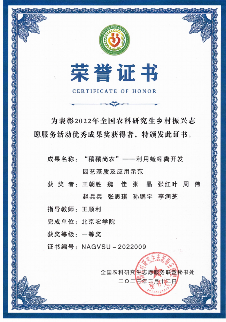 近日,2022年全国农科研究生乡村振兴志愿服务活动成果评选结果揭晓。世俱杯生物与资源环境学院王顺利副教授指导,王朝胜、魏佳等9名研究生同学共同完成的“穰穰尚农-利用蚯蚓粪开发园艺基质及应用示范”获评优秀成果一等奖。