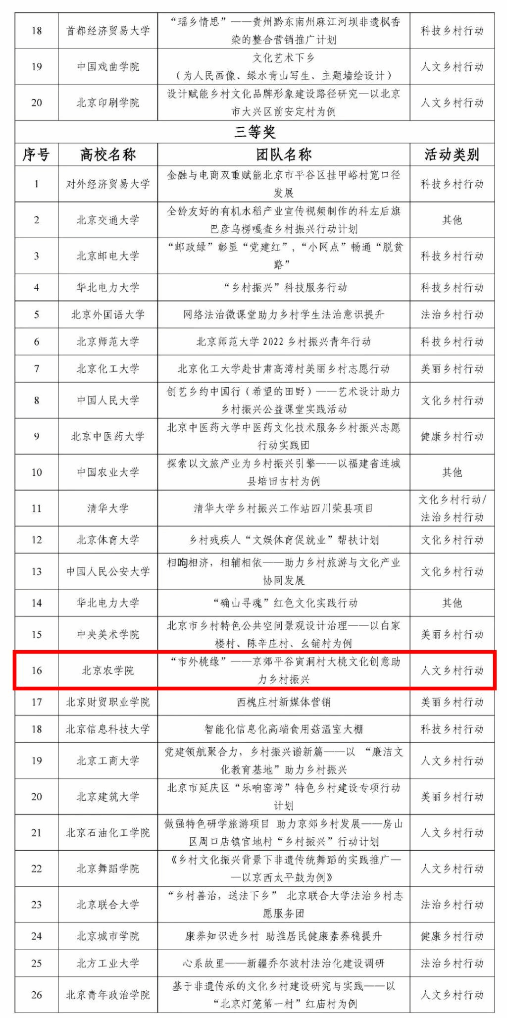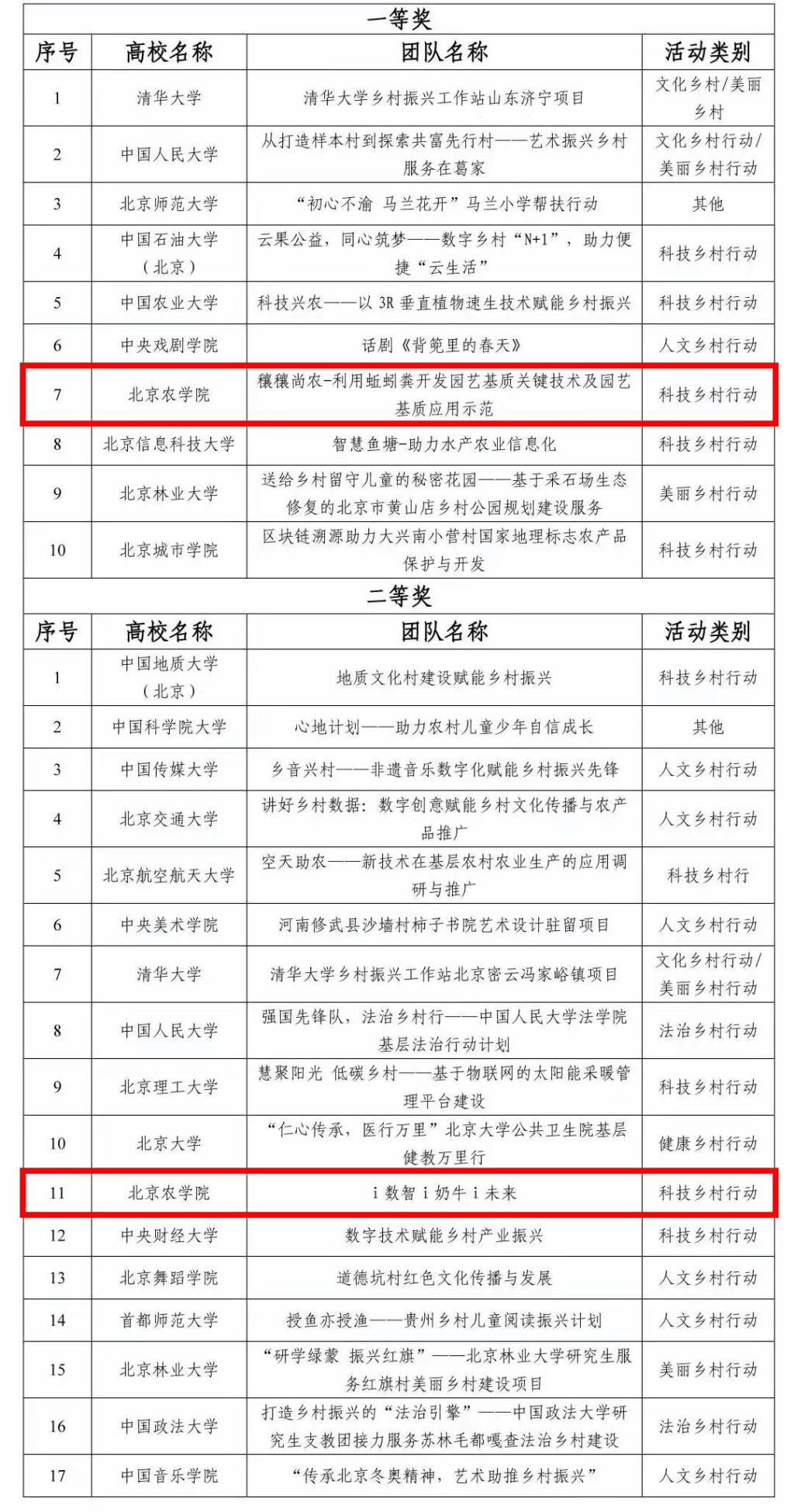 近日,北京市学校思想政治工作中心发布了《关于首都高校师生服务“乡村振兴”行动计划成果评审结果的公告》。经过学校推荐、专家评审,共评选一等奖10项、二等奖20项、三等奖30项、优秀奖38项。世俱杯申报的7支团队全部获奖,其中一等奖1项,二等奖1项,三等奖1项,优秀奖4项,获奖数量在首都高校居于首位。