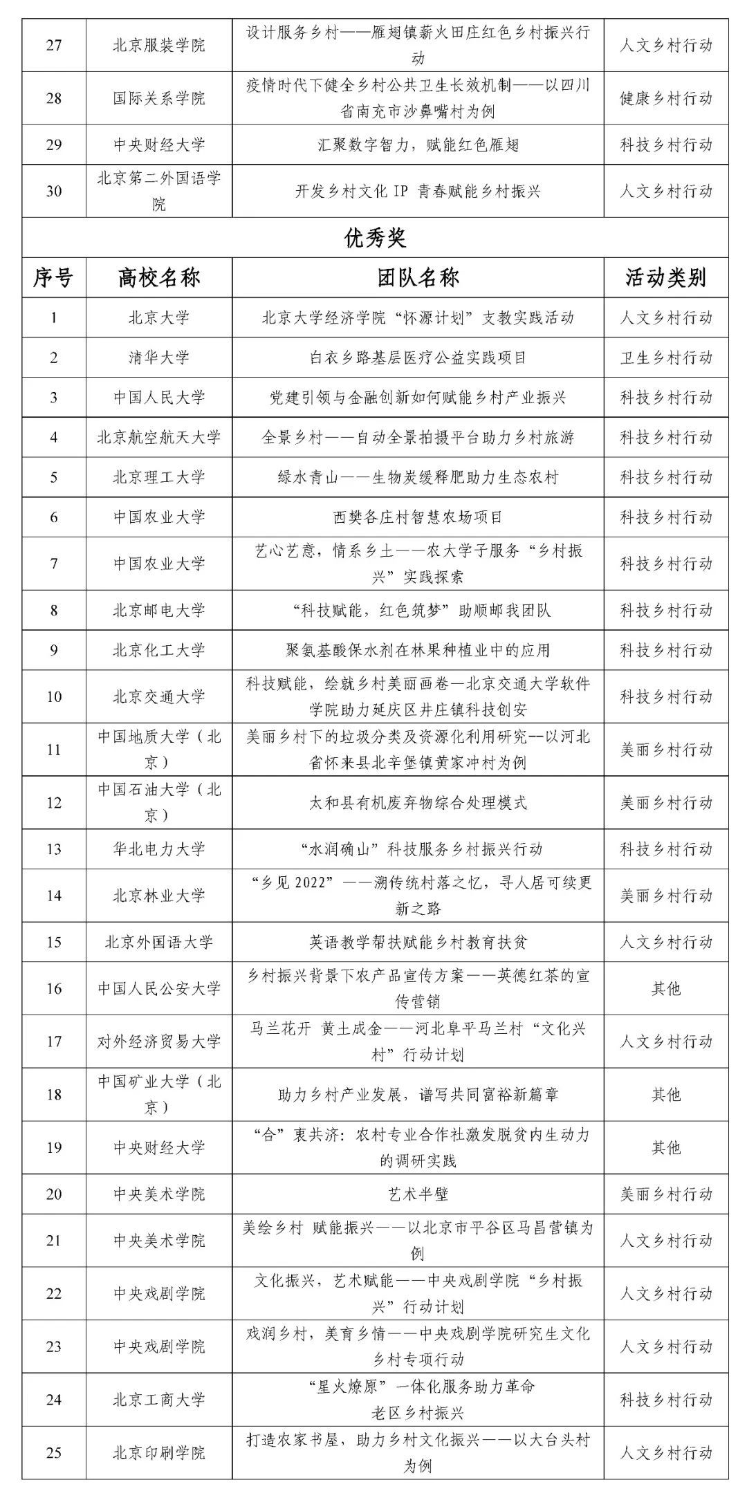今年6月,市委教育工委、市教委启动首都高校师生服务“乡村振兴”行动计划,遴选优秀团队,奔赴全国22个省、市、自治区的119个乡村开展实践,助力乡村发展,取得显著效果。为进一步凝练经验、激励先进,经高校推荐、专家评审,共评选一等奖10项、二等奖20项、三等奖30项、优秀奖38项,现将获奖名单予以公布。