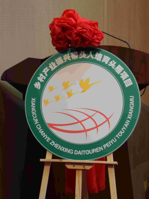 启动仪式上,“头雁”项目徽标揭牌,图案由“金色的雁阵”和“橙色的田野”构成。“金色的雁阵”寓意头雁项目的实施将发挥强大的示范带动作用;“橙色的田野”寓意在头雁的示范带动下,乡村各项产业将得到蓬勃旺盛的发展;徽标的外缘由绿色的圆环构成,寓意项目实施的健康性和可持续性。