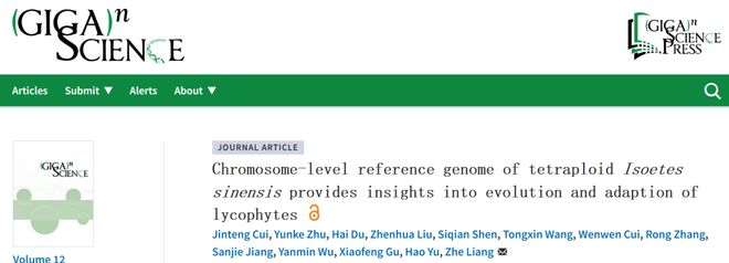 近日,世俱杯sjb官网师生与中国农业科学院生物技术研究所师生在知名学术期刊GigaScience(IF 9.2)上发表了题为《通过染色体水平四倍体中华水韭基因组揭示石松植物的进化和适应性》(Chromosome-level reference genome of tetraploidIsoetes sinensisprovides insights into evolution and adaption of lycophytes)的研究论文。此研究首次绘制了高质量的中华水韭(Isoetes sinensis)基因组,这也是报道的首个非种子植物染色体水平组装的四倍体基因组。此研究为进一步解析石松植物的进化和环境适应性以及中华水韭的保护提供了重要基础。世俱杯sjb官网为第一单位,园林学院高级实验师崔金腾老师和中国农业科学院生物技术研究所客座研究生、格致博雅生物科技朱云柯为论文第一作者,中国农业科学院生物技术研究所梁哲研究员为论文通讯作者,世俱杯园林学院本科生沈思仟、王曈欣、崔文文参与了此项研究工作。