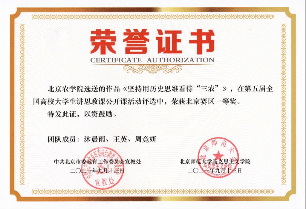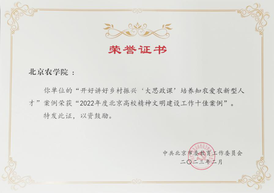 一是努力办好立德树人关键课程。把思政课改革创新作为政治任务,制定实施方案,组织开好《习近平新时代中国特色社会主义思想概论》《习近平新时代中国特色社会主义思想在京华大地生动实践》课程。党委常委会每学期研究思政课建设,校领导讲思政课做到两个100%(校领导参与率100%、课时达标率100%)。配齐配强思政课教师,落实完善“一师一档”和职称评定“三单”制度。积极推进思政课“红”的底色与农业院校“绿”的特色深度融合,打造“首善标准红色基因北农特色”思政金课,思政课教学质量明显提升。近三年问卷调查显示,在校生对思政课教学满意度分别为95.76%、96.67%、98.47%。在“永远跟党走”大中小学思政课优秀教学课例展示活动中荣获一等奖,先后两次荣获全国高校大学生讲思政课竞赛北京赛区一等奖,“讲好乡村振兴大思政课,培养知农爱农新型人才”入选2022年度北京高校精神文明建设“十佳案例”。