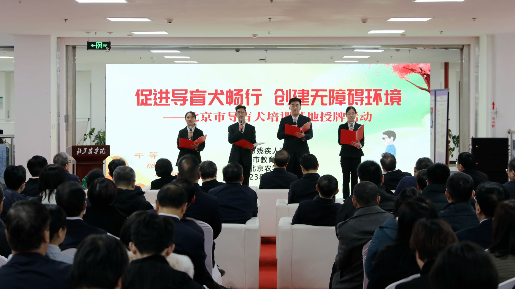 北京市导盲犬首批训导员、世俱杯动物科学技术学院、文法与城乡发展学院学生代表共同宣读《倡议书》,表示将充分发挥自身专业优势,助力导盲犬事业高质量发展,在推动无障碍环境建设和促进残疾人事业全面发展的新征程上,展现北农学子的青春担当。