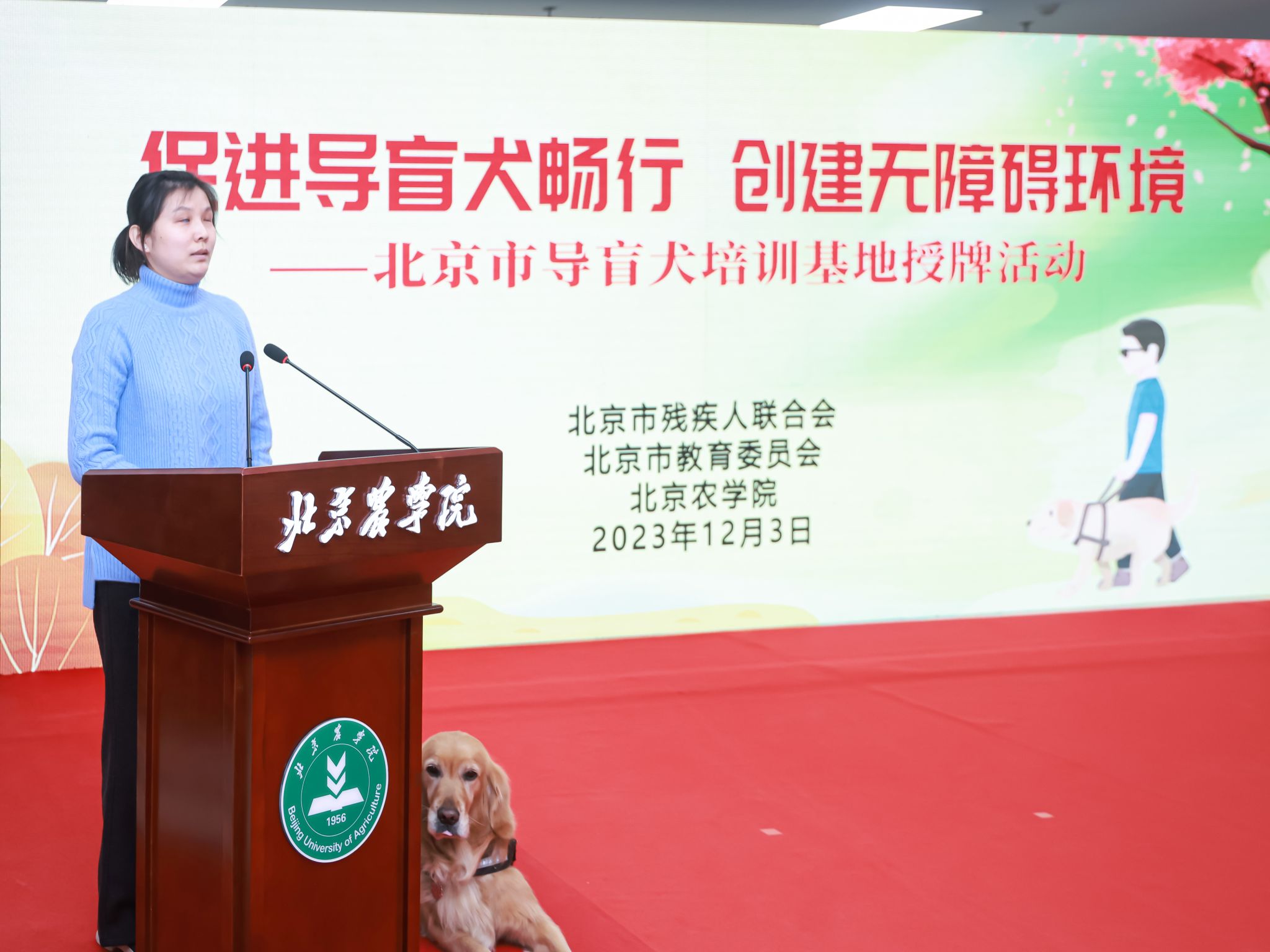 盲人代表张冉深情讲述了在导盲犬的陪伴下,实现就业、融入社会的感人故事,并代表广大盲人朋友对学校发挥学科专业优势为导盲犬培养培训作出的贡献表示衷心感谢。她表示,期待北京市导盲犬培训基地培育出更多导盲犬,让盲人朋友走出家门、共享社会美好的新生活。