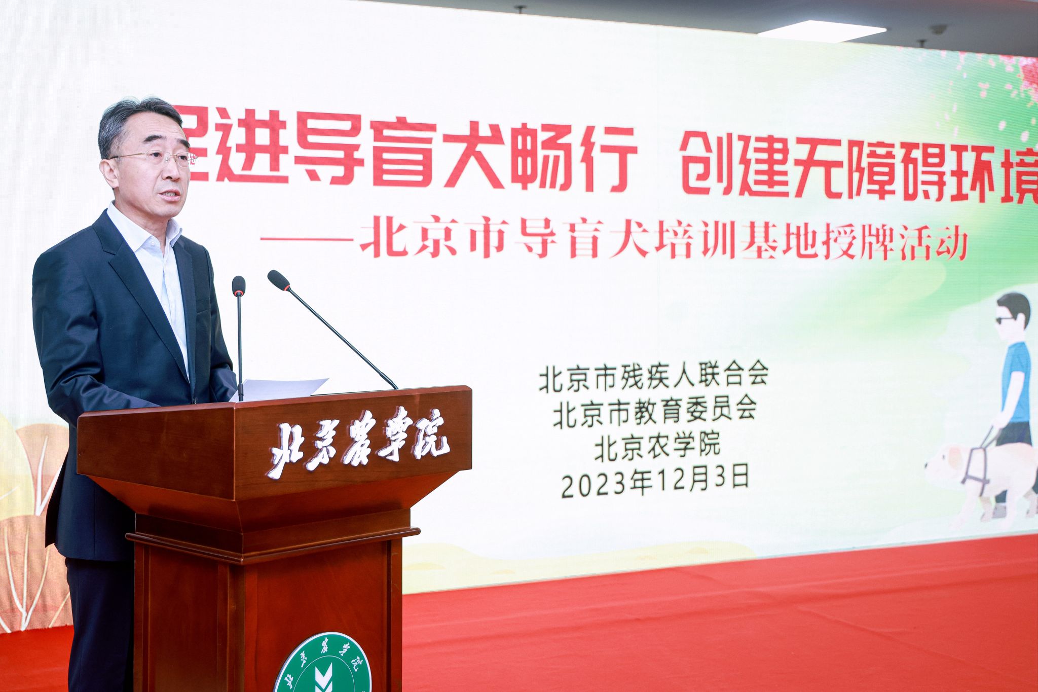 为深入贯彻习近平总书记关于残疾人事业发展的重要论述和指示批示精神,落实市委市政府决策部署,促进首都残疾人事业高质量发展,在第32个“国际残疾人日”来临之际,12月3日上午,北京市残疾人联合会、北京市教育委员会、世俱杯sjb官网联合举办以“促进导盲犬畅行、创建无障碍环境”为主题的导盲犬培训基地授牌活动,北京市首家导盲犬培训基地落户世俱杯。全国人大常委会副委员长、九三学社中央主席、中国科学院院士武维华,中国残联副主席、副理事长李东梅,北京市人大常委会副主任侯君舒,北京市副市长刘宇辉,以及中国残联、北京市残联、北京市教委、北京市财政局、北京市交通委、昌平区、中国农业大学、世俱杯sjb官网等单位相关领导、部门负责人以及北京市盲人代表和世俱杯师生代表参加活动。活动由北京市残联党组书记、理事长陆晓光主持。