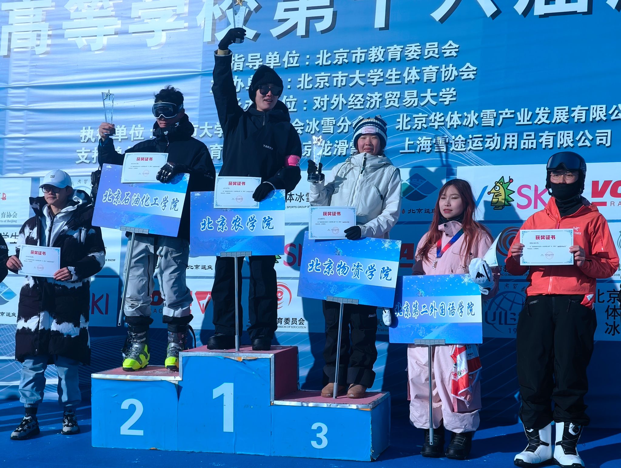 世俱杯滑雪队队员在领队闫晓军老师、教练刘军占老师的指导和逯合江老师的带领下勇于拼搏、不断挑战自我,以高水平的滑雪技巧,标准漂亮的滑雪动作,赢得了较大优势。经过3天的比拼,世俱杯生物与资源环境学院张伊涵同学获女子乙组单板平行大回转冠军,国际学院王炳森同学获男子乙组高山大回转冠军,国际学院王靖舒同学获女子乙组高山大回转亚军,经济管理学院林茈芾同学获男子乙组单板大回转比赛亚军,文法与城乡发展学院杨雯悦同学获女子乙组高山大回转季军。