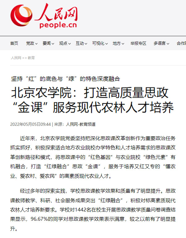 学校领导班子带头讲思政课在首都高校率先做到了“两个100%”,即领导班子参与率100%、课时达标率100%。特别是学校党委书记带头、全体院领导跟进,为北农青年学生讲授生态文明、乡村振兴、脱贫攻坚、“三农”发展、北大荒精神等“绿色课程”,及时将“三农”相关主题、元素融入形势与政策课中,带头将农业院校的“绿元素”融入思政课教学的“红课堂”;全体思政课教师积极响应,特别是一些原来具有农科背景、后期转岗思政课教学的教师,变“先天不足”为“后发优势”,全面、深入地将党的二十大关于“全面推进乡村振兴”的战略部署、习近平总书记关于“三农”工作的重要论述、“中央一号文件”精神等主题内容融入思政课程,带动全体思政课教师做到“红绿融合”;学院在昌平区、平谷区等乡镇村建立思政课教学实践基地,思政课教师主动深入“三农”一线调查研究、了解农情民意,将课堂教材中的理论知识与“三农”一线、田间地头的绿色元素有机结合,增强“红绿融合”教学效果。