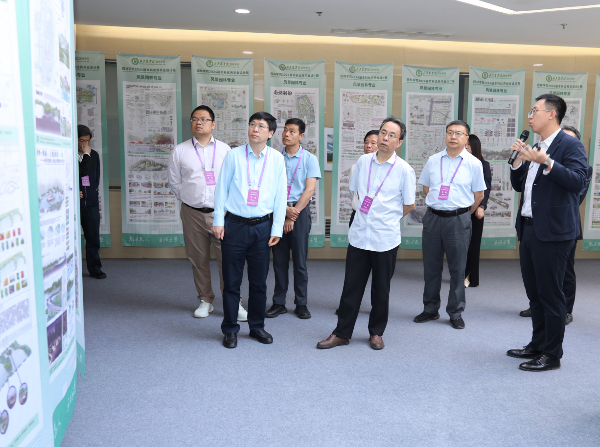在园林学院,专家组一行参观了风景园林、环境设计专业本科生优秀毕业设计作品展,了解学校聚焦乡村全面振兴、休闲农业发展需求培养高水平应用型都市农林人才的做法。现场观摩了师生插花艺术实践,了解学校立足专业特色,大力弘扬中国传统插花艺术和花文化,推动美育浸润工作更好落实的具体做法和成果。