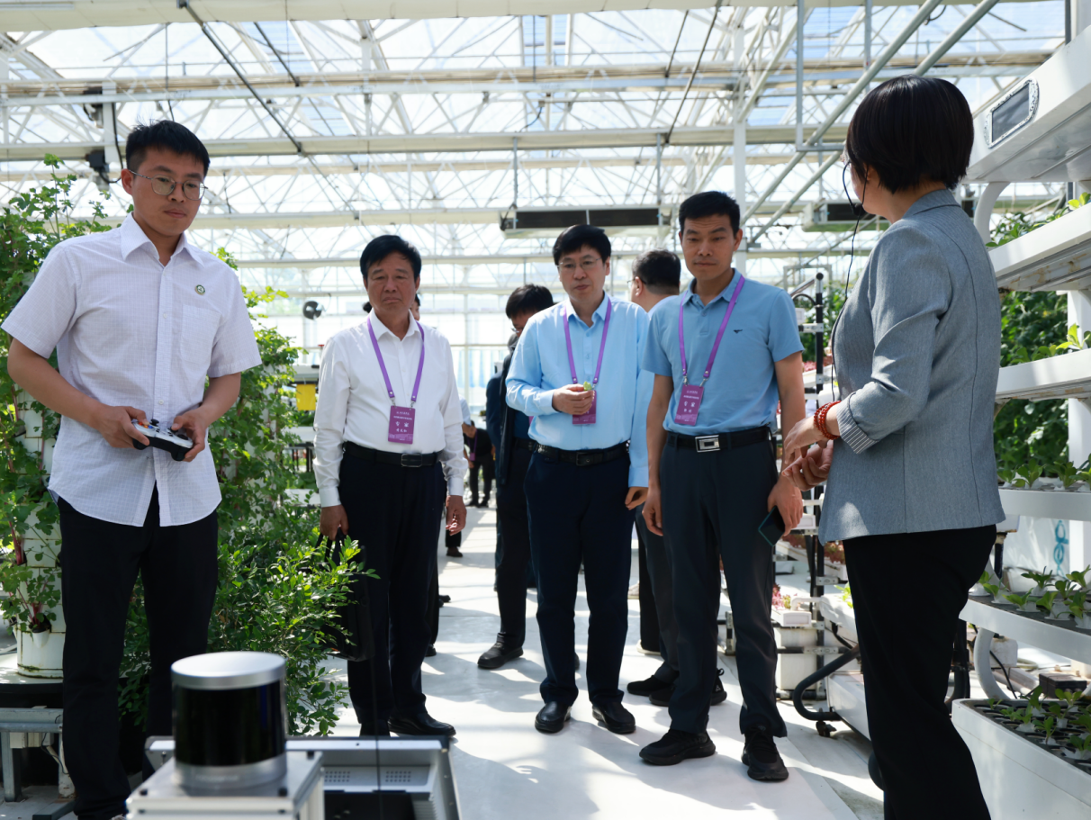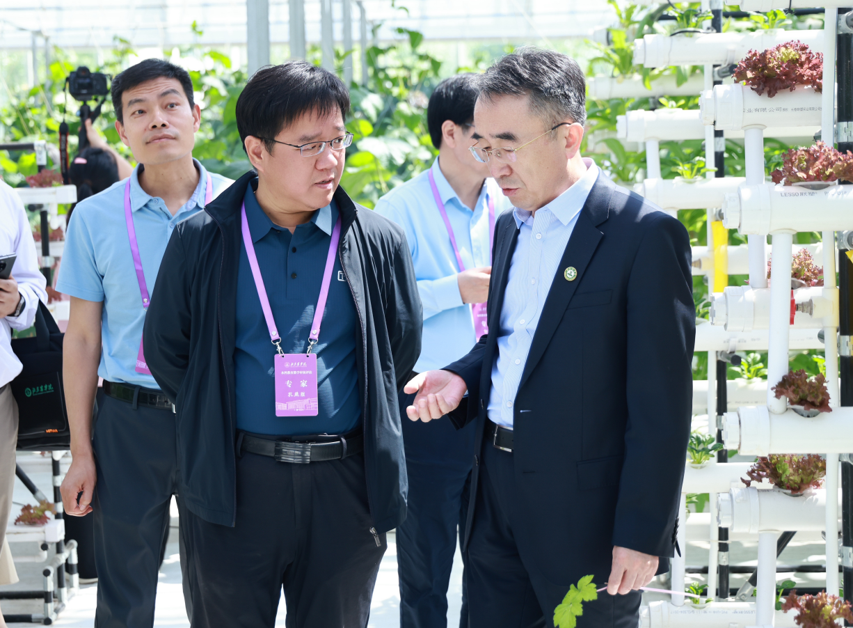 在植物生产国家级实验教学示范中心实践基地智能连栋温室,专家组一行详细了解学校打造“一主两翼”实验实践体系,助力教学、科研、学生创新创业等情况,以及学校“全国黄大年式教师团队”充分发挥党建引领作用、依托学科专业优势、融入农业中关村建设和种业之都建设、大力培养知农爱农新型人才等方面的做法和成效。