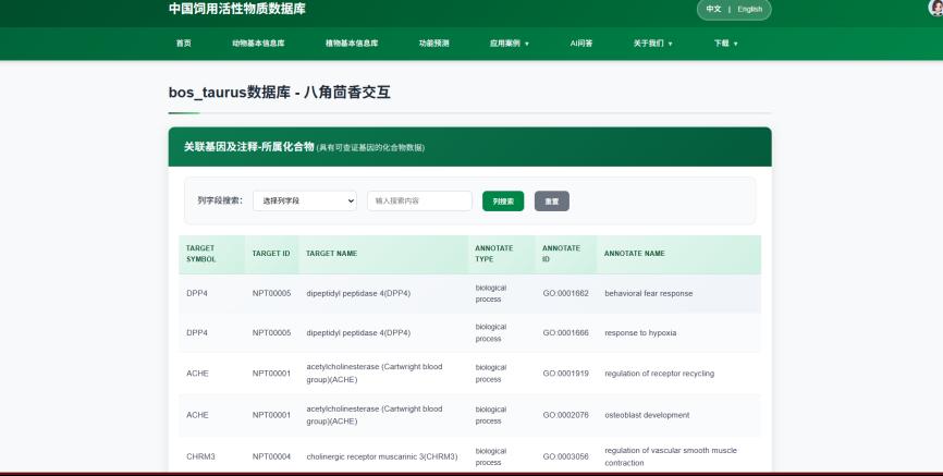 图3 专用数据库天然植物与奶牛预测效应页面(案例)