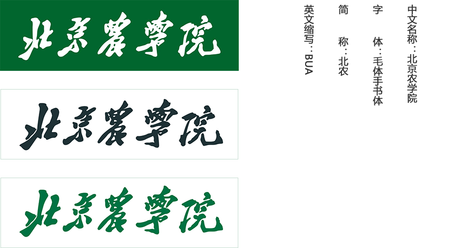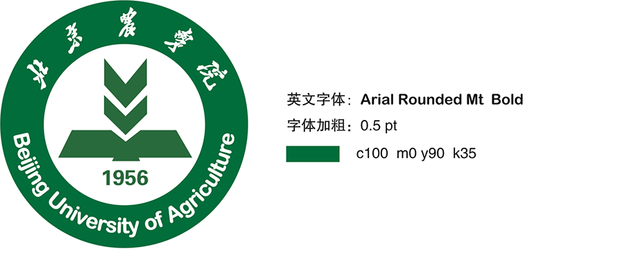 两圆环之间上半部分为学校中文毛体手书体名称,下半部分为英文校名 “Beijing University of Agriculture”,