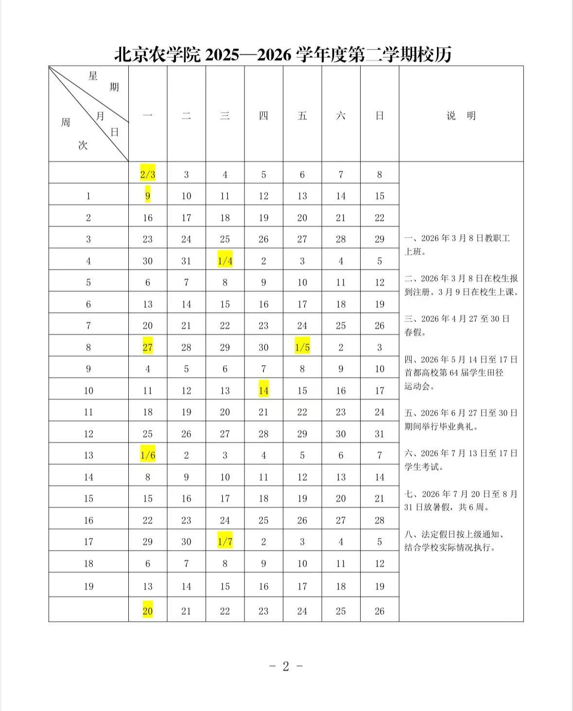 2025-2026学年度第二学期校历