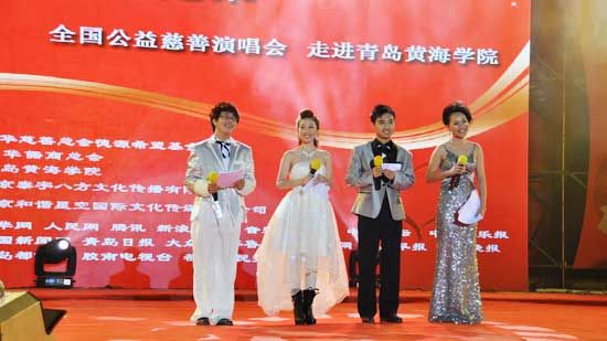 晚会由央视《绿色中国》栏目主持人戴骐帆、刘洋主持。众师生在现场观看了中华慈善总会荣誉副会长、德源希望基金会理事长、慈善家、演讲家蔡光胜、中央民族乐团青年歌唱家、爱心大使陈笑玮、北京泰宇八方文化传播有限公司董事长(一位崇尚大爱的音乐传播者)董小平(艺名:小董哥)、多次参加中央电视台《中华情》、《欢乐中国行》等大型晚会及演唱会的彩乐团组合、策划人、词曲作家、歌唱家、CCTV导演、中国音乐家音像出版社总编张友殿北京歌舞剧院青年歌唱家、爱心大使张爱、中国武警文工团青年歌唱家、爱心大使张涛等十余位明星的精彩表演。彩乐团的《惹火》,董小平的《水手》、《走进阳光》,陈光玮的《感谢你》、《带上爱飞翔》,张爱的《天路》《红旗飘飘》,张涛的《欢乐喜相逢》、《祝福你》、《有爱的世界真美》,张友殿的《乌苏里船歌》、《桃花依旧笑春风》《天下父母心》,蔡光胜的《有事你就说》《让爱循环起来》《爱立方》等依次演出,高潮迭起。歌声、掌声、欢呼声此起彼赴,激起了沸腾的海洋。这些歌唱家的演唱,主题鲜明,格调清新,旋律优美,声情并茂,唱彻了黄海校园,穿透了珠山秀谷,久久徊荡在青岛西海岸。