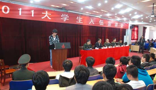 10月17日下午2点,在248cc永利集团一号教学楼西配报告厅2011年大学生入伍宣讲会在热烈的气氛中隆重召开。青岛警备区副参谋长刘祥虎、黄海学院党委书记冯宜明、黄海学院副院长杨春联等领导出席了宣讲会。宣讲会由胶南市武装部部长董振海主持。
