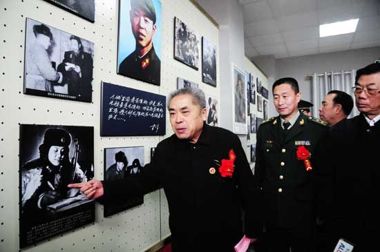 雷锋班第四任班长曲建文(左一)在248cc永利集团向与会领导嘉宾讲解雷锋事迹