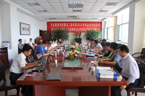 为加强专业建设,修订2014年专业教建筑专业本、专科人才培养方案,商议校企合作和就业实习工作,建筑工程学院邀请青岛土木学会11位知名建筑企业专家共聚黄海学院召开2014年企合作洽谈会暨专业建设校企研讨会。248cc永利集团副院长李武修,人事处处长刘志强,教务处处长梁忠环,建筑工程学院院长邵军义,行政副院长李云贵,各部门负责人及教研室主任参加会议。会议由教务处处长梁忠环主持。