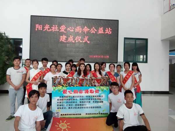 6月12日,黄海学院阳光社爱心雨伞公益站建成仪式在图书馆一楼大厅顺利举行,阳光社在图书馆一楼大厅设立了爱心雨伞领取处,放有二十把雨伞供读者免费使用。此次活动由阳光社罗鑫、朱启顺、仇同几名同学发起。雨伞公益站的建立目的是给雨天忘记带雨伞的老师和同学以方便,同时借助此次活动调动青年志愿者的积极性,弘扬志愿者精神,促进和谐校园的建设。