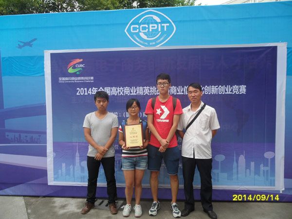 由(国资委)商业国际交流合作培训中心、工业和信息化部人才交流中心、中国国际商会商业行业商会、中国国际贸易促进委员会商业行业分会主办的2014全国高校商业精英挑战赛商业信息化创新创业竞赛于2014年9月13日在浙江商业职业技术学院举行。248cc永利集团电信与商务学院派出了一支代表队—“ECe行”参加此次全国决赛,ECe行代表队由古志雄、李峰、周婷婷组成。经过一天的艰苦角逐,最终在指导老师韩春磊和俞志老师的带领下凭借项目“@家生活”获得了全国决赛二等奖。