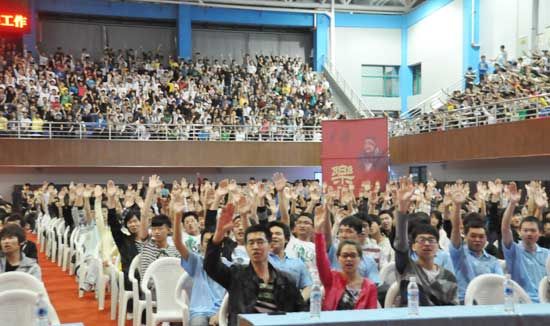 2011年5月26日晚,我院在室内体育场隆重举行“让生命充满爱”弘扬社会主义荣辱观大型爱国主义演讲报告会。香港汤恩佳孔子思想宣讲团副团长、上海修贤教育机构签约讲师、我国青年演讲家李亚军先生应邀到校演讲。全院三千多名师生员工到场聆听。